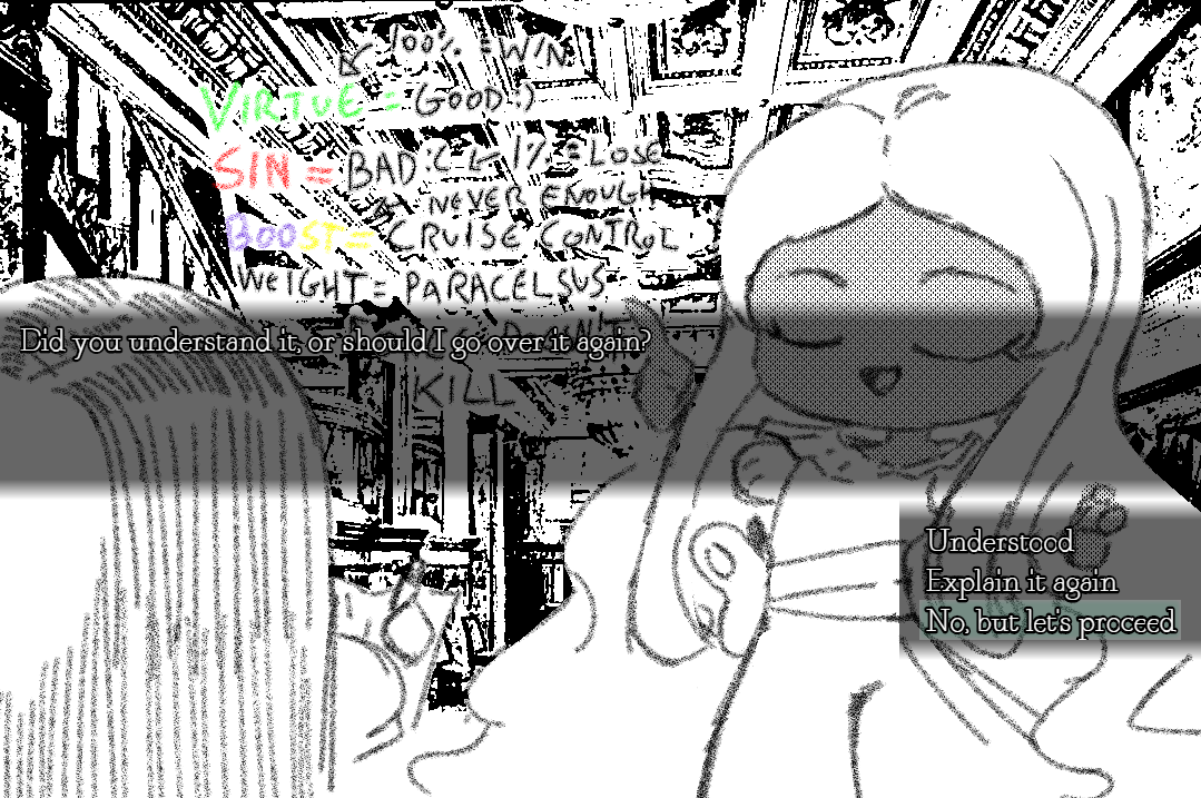 One Sin, Hundreds of Virtues is, essentially, heads or tails. Each face of the coin holds an effect that drives you towards or further away from the two wincons: Reaching 100% Virtue, or leading your opponent to 1% Sin. (On Easy mode, there is no opponent, you simply have to get yourself to 100% Virtue.)